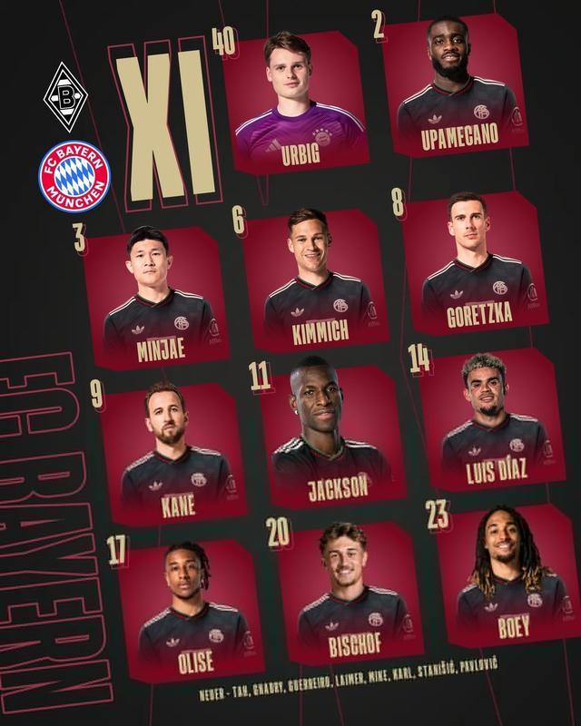 拜仁客战门兴:凯恩、雅克松首发,格雷茨卡、乌尔比希出战